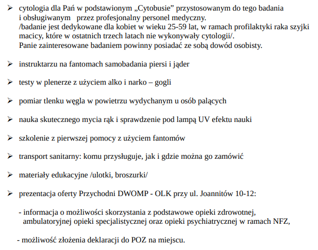 W dniu 07.09.2023r w godzinach od 10:00-13:00zapraszamy wszystkich mieszkańców Wrocławia, a w szczególności kobiety na Dziedziniec Urzędu Pracy we Wrocławiu przy ul. Glinianej 20/22, gdzie w ramach zorganizowanego "Miasteczka Zdrowia" będzie możliwość skorzystania z następującej oferty: